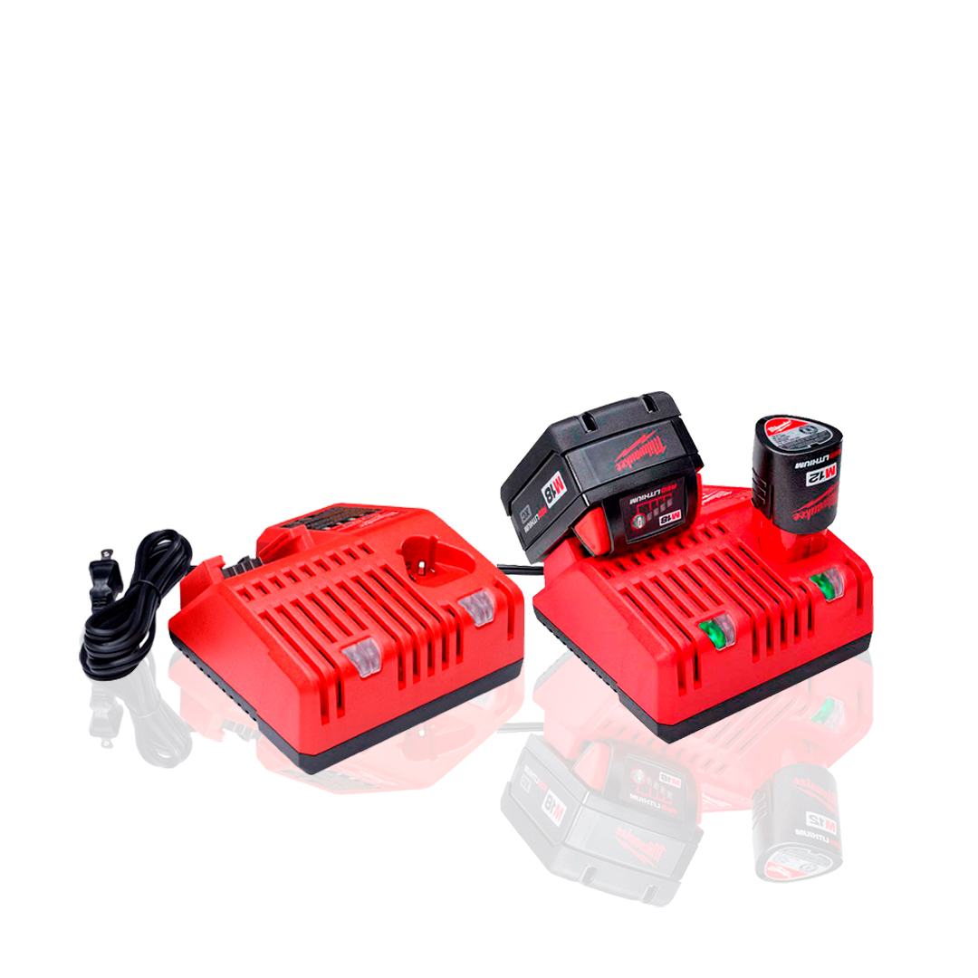 - El cargador múltiple acepta todas las baterías M12 y M18. Esta unidad versátil carga las baterías de forma secuencial, lo que reduce el tiempo necesario para gestionar los ciclos de carga.