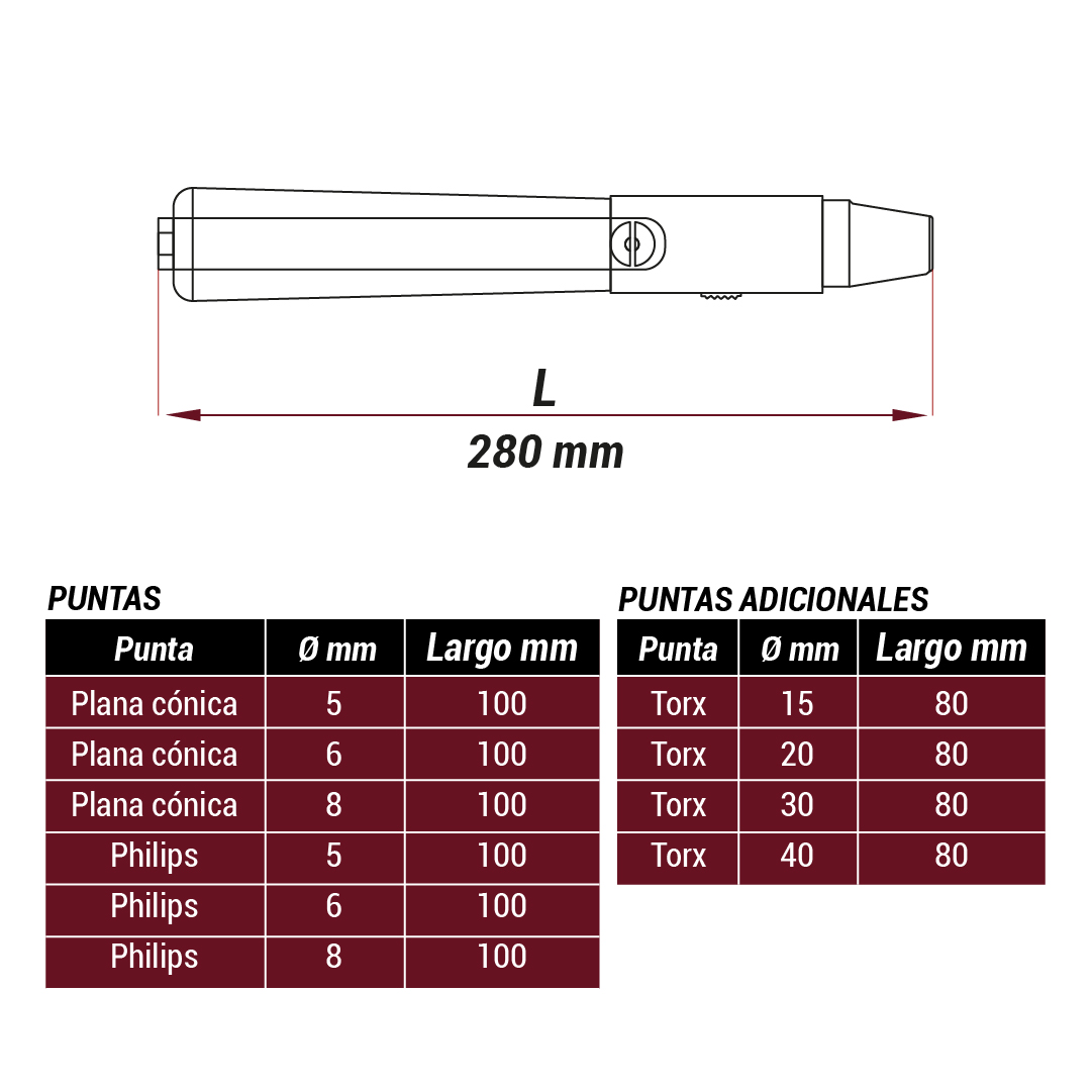 - El destornillador de impacto, también llamado de fuerza, cuenta con una estructura de alta rigidez con palanca para aumentar el torque y con puntas intercambiables.