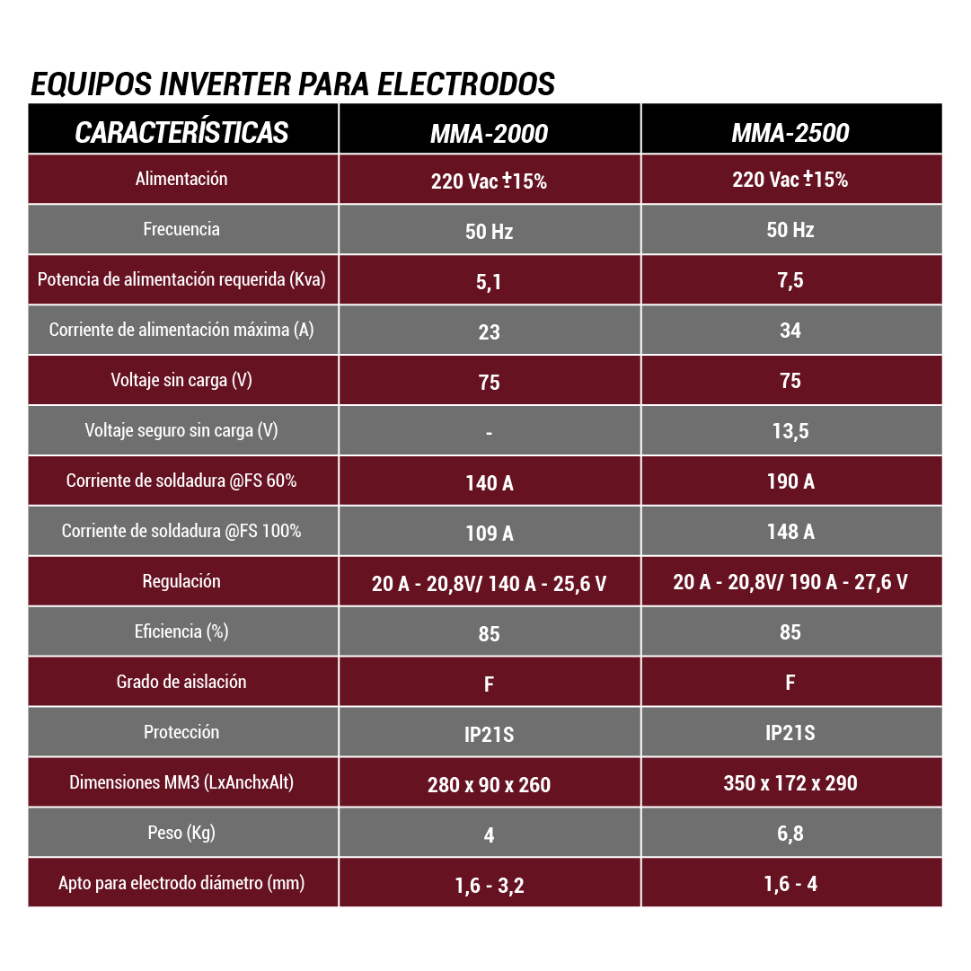 - Es un equipo de soldadura rectificador de corriente continua inverter, portátil y con diseño compacto con regulación electrónica. Permite soldar en sistema MMA (electrodos revestidos) aptos para múltiples aplicaciones con un gran desempeño.