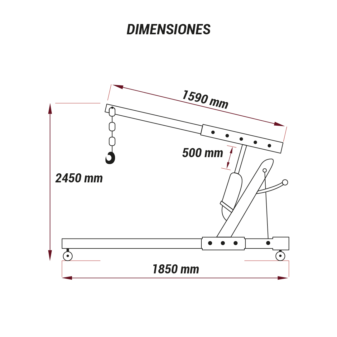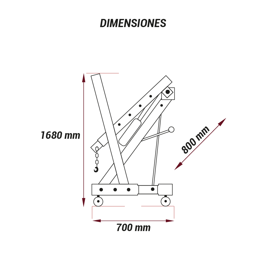 - El guinche cuenta con brazo telescópico, patas rebatibles para liberar el espacio en el taller, ruedas de fundición de alta durabilidad y sistema de crapodinas para facilitar la maniobrabilidad. Es desarmable.