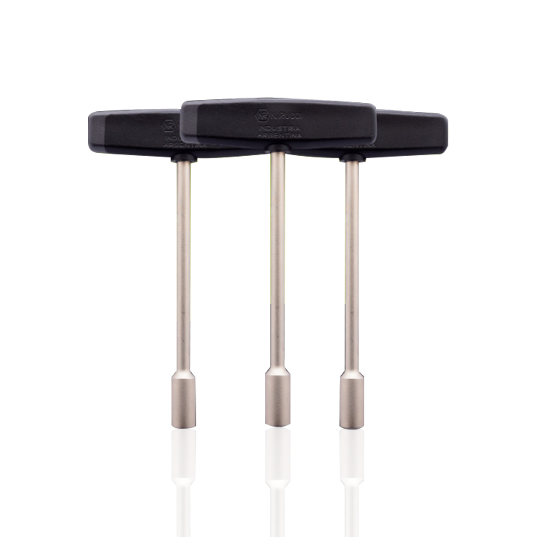 - Las llaves T de N.Rucci son sinónimo de calidad nacional. Se utilizan para apretar y aflojar los tornillos de cabeza hexagonal en lugares profundos y estrechos. Este juego incluye piezas de 6 a 14 mm las cuales cuentan con mangos anatómicos de polipropileno reforzado interiormente con barra de acero ajustado al vástago.
