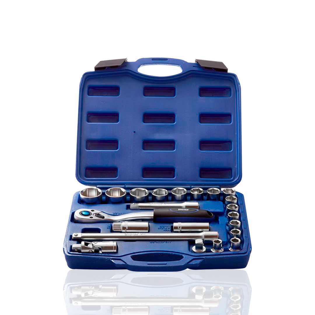 El juego de tubos es una herramienta completa que incluye 15 bocallaves hexagonales, 2 bocallaves saca Bujías, 2 barras de extensión, 1 llave crique 1/2″, 1 adaptador y 1 movimiento universal. Este juego es una solución integral de alta calidad para el rápido ajuste y desajuste de la mayoría de tornillos y bulones métricos de pequeño y mediano tamaño.