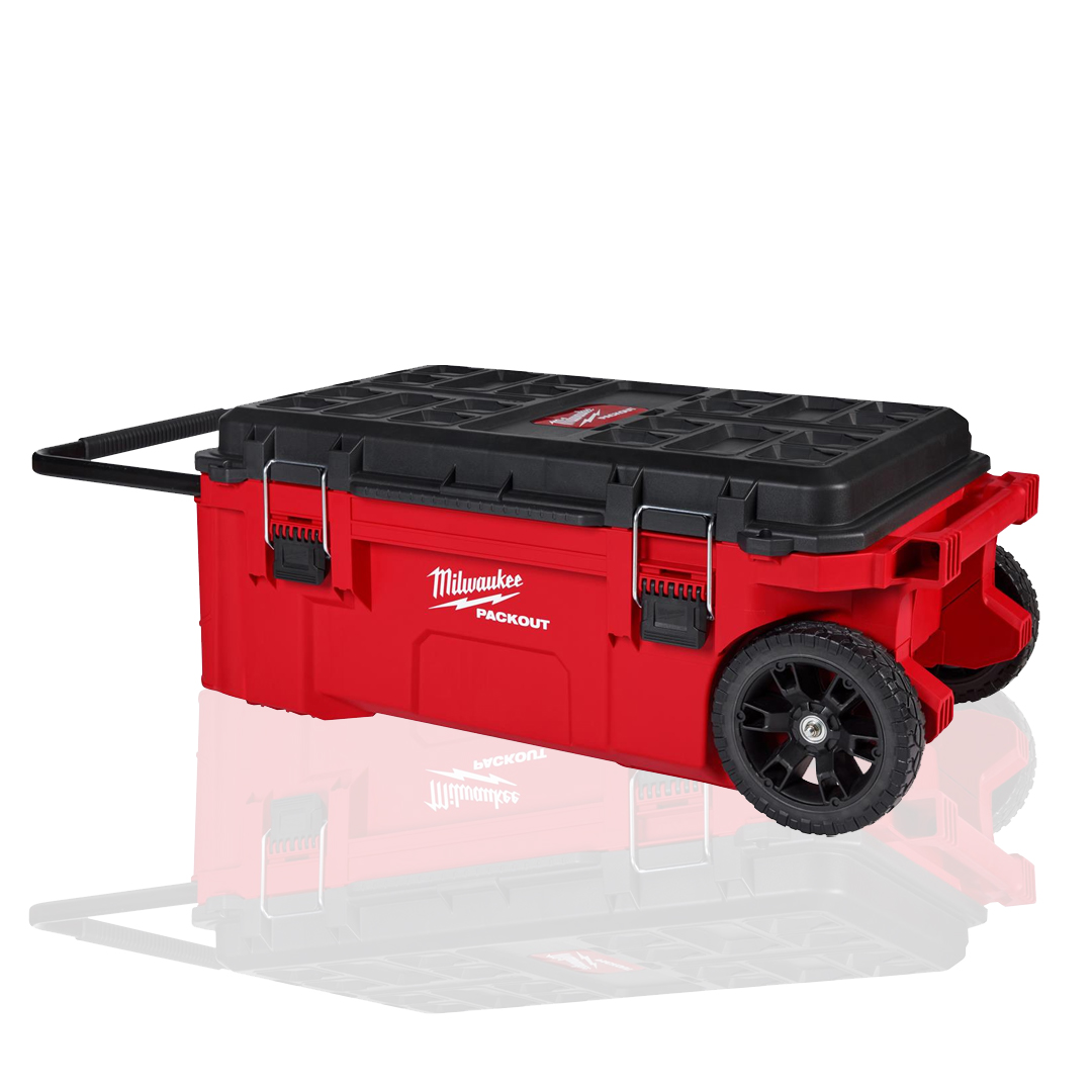 - Packout Milwaukee con ruedas todo terreno y resistencia al agua. De estructura versátil y duradero. Cuenta con un mango de extensión para un agarre cómodo.